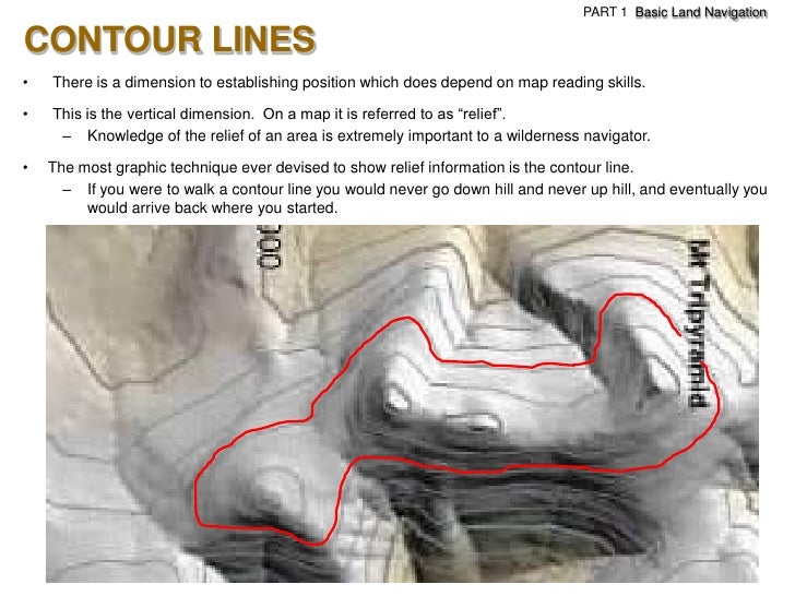 73. 73. PART 1 Basic Land NavigationCONTOUR LINES• There is a dimension to establishing position which does depend on map reading skills.• This is the vertical dimension. On a map it is referred to as ―relief‖. – Knowledge of the relief of an area is extremely important to a wilderness navigator.• The most graphic technique ever devised to show relief information is the contour line. – If you were to walk a contour line you would never go down hill and never up hill, and eventually you would arrive back where you started.