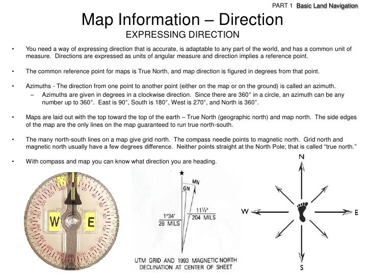 87. 87. PART 1 Basic Land Navigation Map Information – Direction EXPRESSING DIRECTION• You need a way of expressing direction that is accurate, is adaptable to any part of the world, and has a common unit of measure. Directions are expressed as units of angular measure and direction implies a reference point.• The common reference point for maps is True North, and map direction is figured in degrees from that point.• Azimuths - The direction from one point to another point (either on the map or on the ground) is called an azimuth. – Azimuths are given in degrees in a clockwise direction. Since there are 360° in a circle, an azimuth can be any number up to 360°. East is 90°, South is 180°, West is 270°, and North is 360°.• Maps are laid out with the top toward the top of the earth – True North (geographic north) and map north. The side edges of the map are the only lines on the map guaranteed to run true north-south.• The many north-south lines on a map give grid north. The compass needle points to magnetic north. Grid north and magnetic north usually have a few degrees difference. Neither points straight at the North Pole; that is called ―true north.‖• With compass and map you can know what direction you are heading.