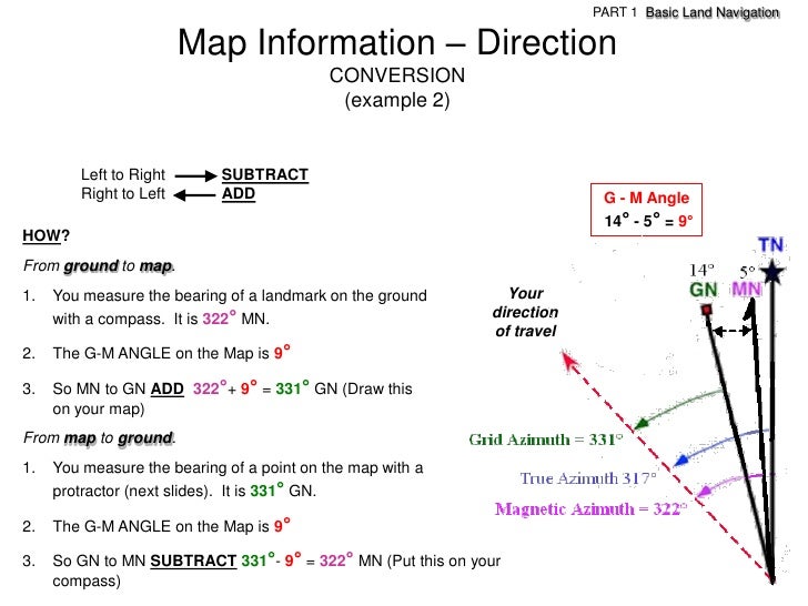 91. 91. PART 1 Basic Land Navigation Map Information – Direction CONVERSION (example 2) Left to Right SUBTRACT Right to Left ADD G - M Angle 14° - 5° = 9°HOW?From ground to map.1. You measure the bearing of a landmark on the ground Your with a compass. It is 322° MN. direction of travel2. The G-M ANGLE on the Map is 9°3. So MN to GN ADD 322°+ 9° = 331° GN (Draw this on your map)From map to ground.1. You measure the bearing of a point on the map with a protractor (next slides). It is 331° GN.2. The G-M ANGLE on the Map is 9°3. So GN to MN SUBTRACT 331°- 9° = 322° MN (Put this on your compass)