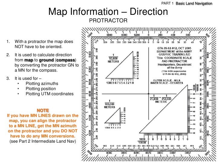 93. 93. PART 1 Basic Land Navigation Map Information – Direction PROTRACTOR1. With a protractor the map does NOT have to be oriented.2. It is used to calculate direction from map to ground (compass) by converting the protractor GN to a MN for the compass.3. It is used for – • Plotting azimuths • Plotting position • Plotting UTM coordinates NOTEIf you have MN LINES drawn on the map, you can align the protractor to a MN LINE, get the MN azimuth on the protractor and you DO NOT have to do any MN conversions. (see Part 2 Intermediate Land Nav)