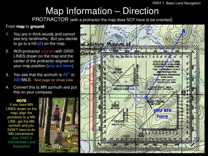95. 95. PART 1 Basic Land Navigation Map Information – Direction PROTRACTOR (with a protractor the map does NOT have to be oriented)From map to ground.1. You are in thick woods and cannot see any landmarks. But you decide to go to a hill (A) on the map.2. With protractor aligned with GRID LINES drawn on the map and the center of the protractor aligned on your map position (you are here).3. You see that the azimuth is 29° or 520 MILS. See previous page4. Convert this to MN azimuth and put this on your compass. NOTE If you have MNLINES drawn on the map, align the protractor to a MN LINE, get the MN azimuth and you DON’T have to do MN conversions. (See PART 2 Intermediate Land Navigation)