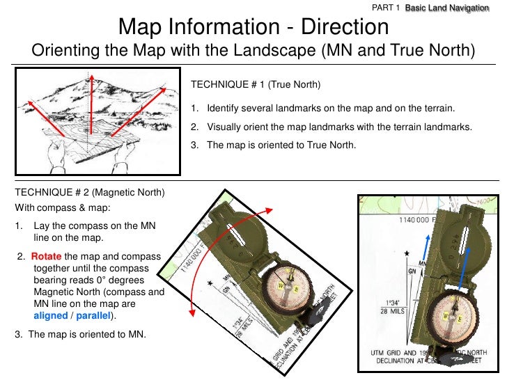 97. 97. PART 1 Basic Land Navigation Map Information - Direction Orienting the Map with the Landscape (MN and True North) TECHNIQUE # 1 (True North) 1. Identify several landmarks on the map and on the terrain. 2. Visually orient the map landmarks with the terrain landmarks. 3. The map is oriented to True North.TECHNIQUE # 2 (Magnetic North)With compass & map:1. Lay the compass on the MN line on the map.2. Rotate the map and compass together until the compass bearing reads 0° degrees Magnetic North (compass and MN line on the map are aligned / parallel).3. The map is oriented to MN.