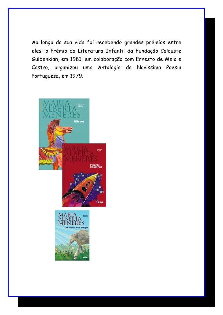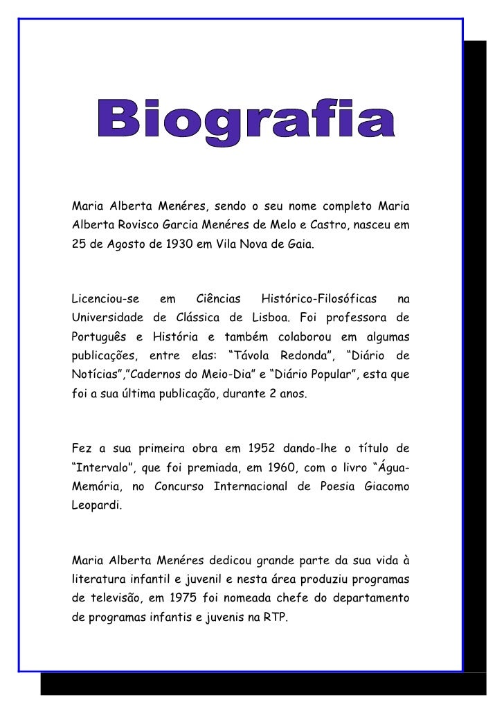 1. 1. Maria Alberta Menéres, sendo o seu nome completo Maria Alberta Rovisco Garcia Menéres de Melo e Castro, nasceu em 25 de Agosto de 1930 em Vila Nova de Gaia. Licenciou-se em Ciências Histórico-Filosóficas na Universidade de Clássica de Lisboa. Foi professora de Português e História e também colaborou em algumas publicações, entre elas: “Távola Redonda”, “Diário de Notícias”,”Cadernos do Meio-Dia” e “Diário Popular”, esta que foi a sua última publicação, durante 2 anos. Fez a sua primeira obra em 1952 dando-lhe o título de “Intervalo”, que foi premiada, em 1960, com o livro “Água- Memória, no Concurso Internacional de Poesia Giacomo Leopardi. Maria Alberta Menéres dedicou grande parte da sua vida à literatura infantil e juvenil e nesta área produziu programas de televisão, em 1975 foi nomeada chefe do departamento de programas infantis e juvenis na RTP.