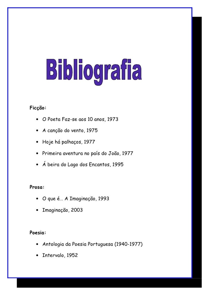 3. 3. Ficção: • O Poeta Faz-se aos 10 anos, 1973 • A canção do vento, 1975 • Hoje há palhaços, 1977 • Primeira aventura no país do João, 1977 • Á beira do Lago dos Encantos, 1995 Prosa: • O que é… A Imaginação, 1993 • Imaginação, 2003 Poesia: • Antologia da Poesia Portuguesa (1940-1977) • Intervalo, 1952