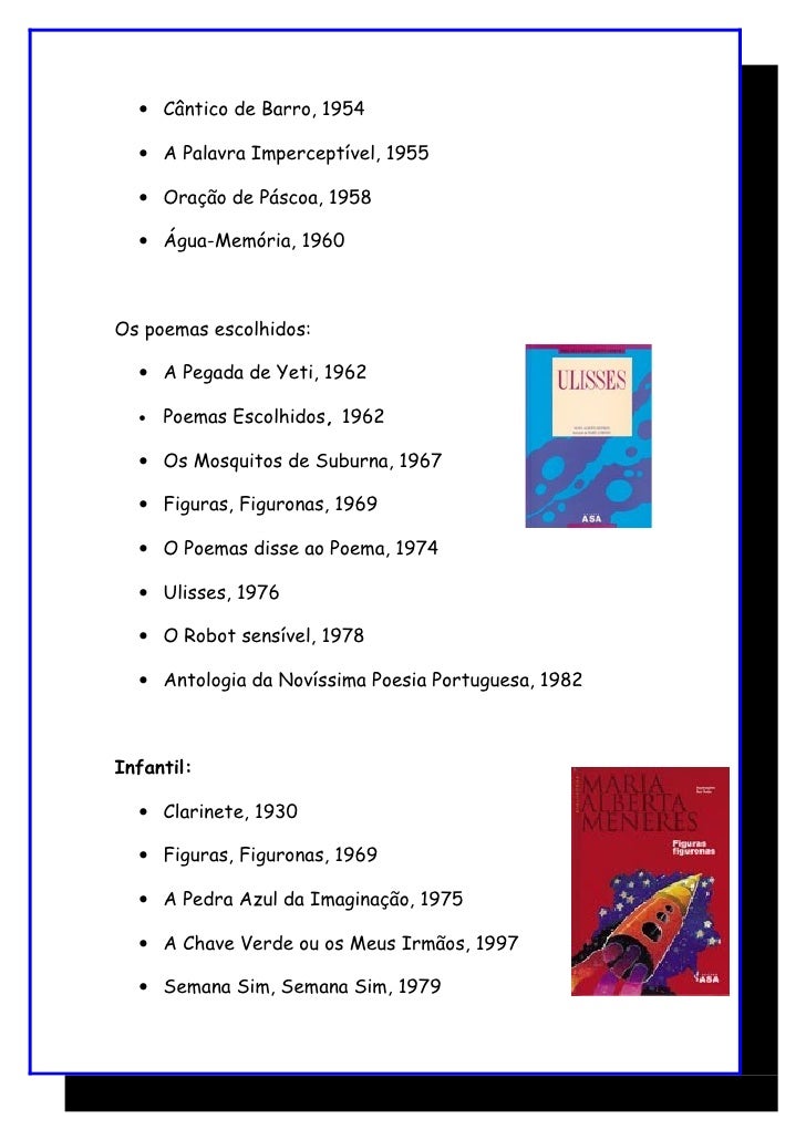 4. 4. • Cântico de Barro, 1954 • A Palavra Imperceptível, 1955 • Oração de Páscoa, 1958 • Água-Memória, 1960 Os poemas escolhidos: • A Pegada de Yeti, 1962 • Poemas Escolhidos, 1962 • Os Mosquitos de Suburna, 1967 • Figuras, Figuronas, 1969 • O Poemas disse ao Poema, 1974 • Ulisses, 1976 • O Robot sensível, 1978 • Antologia da Novíssima Poesia Portuguesa, 1982 Infantil: • Clarinete, 1930 • Figuras, Figuronas, 1969 • A Pedra Azul da Imaginação, 1975 • A Chave Verde ou os Meus Irmãos, 1997 • Semana Sim, Semana Sim, 1979
