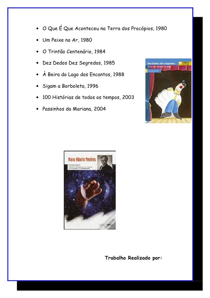 5. 5. • O Que É Que Aconteceu na Terra dos Procópios, 1980 • Um Peixe no Ar, 1980 • O Trintão Centenário, 1984 • Dez Dedos Dez Segredos, 1985 • À Beira do Lago dos Encantos, 1988 • Sigam a Borboleta, 1996 • 100 Histórias de todos os tempos, 2003 • Passinhos da Mariana, 2004 Trabalho Realizado por: