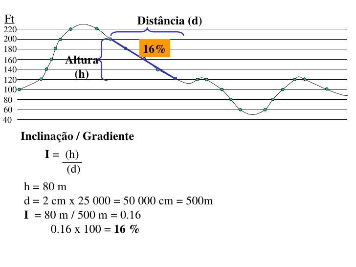 11. 11. 40 Inclinação / Gradiente Ft h = 80 m d = 2 cm x 25 000 = 50 000 cm = 500m I = 80 m / 500 m = 0.16 0.16 x 100 = 16 % 16% 60 80 100 120 140 160 180 200 220 I = (h) (d) Altura (h) Distância (d)