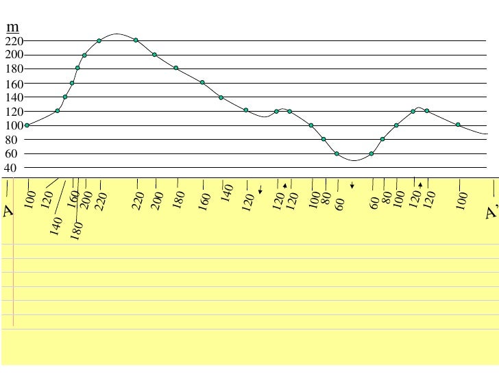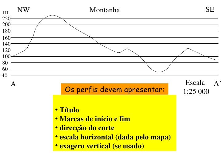 7. 7. 40 Os perfis devem apresentar: A A’ Montanha m NW SE <ul><li>Título </li></ul><ul><li>Marcas de início e fim </li></ul><ul><li>direcção do corte </li></ul><ul><li>escala horizontal (dada pelo mapa) </li></ul><ul><li>exagero vertical (se usado) </li></ul>Escala 1:25 000 60 80 100 120 140 160 180 200 220