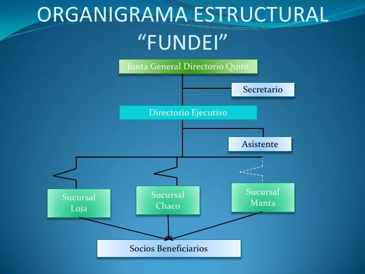 12. 12. ORGANIGRAMA ESTRUCTURAL “FUNDEI”<br />Junta General Directorio Quito<br />Secretario<br />Directorio Ejecutivo<br />Asistente<br />Sucursal<br />Manta<br />Sucursal<br />Chaco<br />Sucursal<br />Loja<br />Socios Beneficiarios<br />