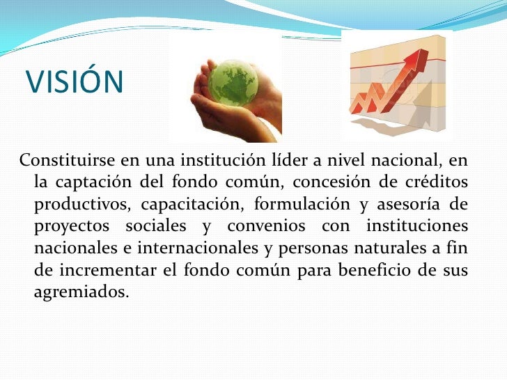 5. 5. VISIÓN<br />Constituirse en una institución líder a nivel nacional, en la captación del fondo común, concesión de créditos productivos, capacitación, formulación y asesoría de proyectos sociales y convenios con instituciones nacionales e internacionales y personas naturales a fin de incrementar el fondo común para beneficio de sus agremiados.<br />