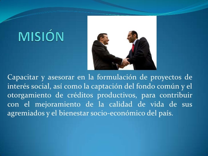 6. 6. MISIÓN<br />Capacitar y asesorar en la formulación de proyectos de interés social, así como la captación del fondo común y el otorgamiento de créditos productivos, para contribuir con el mejoramiento de la calidad de vida de sus agremiados y el bienestar socio-económico del país.<br />
