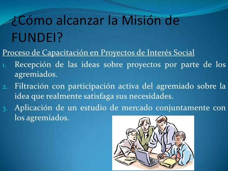 7. 7. ¿Cómo alcanzar la Misión de FUNDEI?<br />Proceso de Capacitación en Proyectos de Interés Social<br />Recepción de las ideas sobre proyectos por parte de los agremiados.<br />Filtración con participación activa del agremiado sobre la idea que realmente satisfaga sus necesidades.<br />Aplicación de un estudio de mercado conjuntamente con los agremiados.<br />