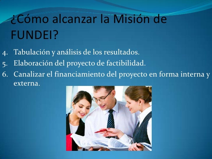 8. 8. ¿Cómo alcanzar la Misión de FUNDEI?<br />4. Tabulación y análisis de los resultados.<br />5. Elaboración del proyecto de factibilidad.<br />6. Canalizar el financiamiento del proyecto en forma interna y externa. <br />