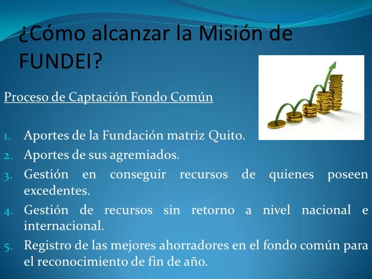 9. 9. ¿Cómo alcanzar la Misión de FUNDEI?<br />Proceso de Captación Fondo Común <br />Aportes de la Fundación matriz Quito.<br />Aportes de sus agremiados.<br />Gestión en conseguir recursos de quienes poseen excedentes.<br />Gestión de recursos sin retorno a nivel nacional e internacional.<br />Registro de las mejores ahorradores en el fondo común para el reconocimiento de fin de año.<br />