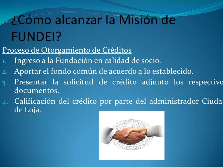 10. 10. Proceso de Otorgamiento de Créditos<br />Ingreso a la Fundación en calidad de socio.<br />Aportar el fondo común de acuerdo a lo establecido.<br />Presentar la solicitud de crédito adjunto los respectivos documentos.<br />Calificación del crédito por parte del administrador Ciudad de Loja.<br />¿Cómo alcanzar la Misión de FUNDEI?<br />