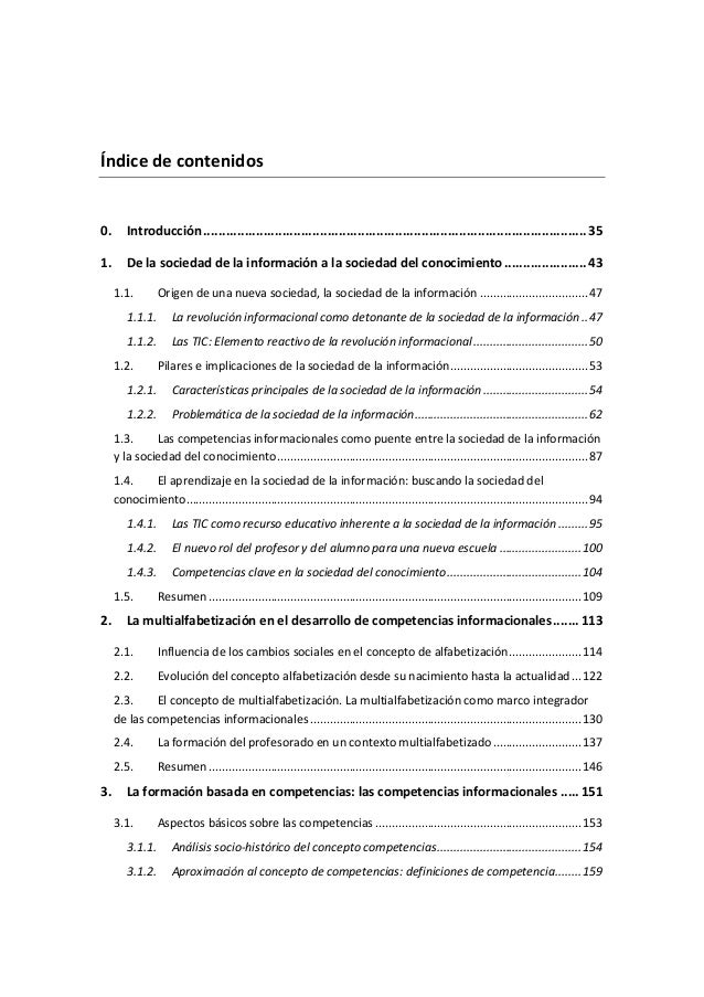 7. 7. Índice de contenidos0. Introducción......................................................................................................351. De la sociedad de la información a la sociedad del conocimiento......................431.1. Origen de una nueva sociedad, la sociedad de la información ................................. 471.1.1. La revolución informacional como detonante de la sociedad de la información.. 471.1.2. Las TIC: Elemento reactivo de la revolución informacional................................... 501.2. Pilares e implicaciones de la sociedad de la información.......................................... 531.2.1. Características principales de la sociedad de la información................................ 541.2.2. Problemática de la sociedad de la información..................................................... 621.3. Las competencias informacionales como puente entre la sociedad de la informacióny la sociedad del conocimiento............................................................................................... 871.4. El aprendizaje en la sociedad de la información: buscando la sociedad delconocimiento........................................................................................................................... 941.4.1. Las TIC como recurso educativo inherente a la sociedad de la información ......... 951.4.2. El nuevo rol del profesor y del alumno para una nueva escuela ......................... 1001.4.3. Competencias clave en la sociedad del conocimiento......................................... 1041.5. Resumen .................................................................................................................. 1092. La multialfabetización en el desarrollo de competencias informacionales.......1132.1. Influencia de los cambios sociales en el concepto de alfabetización...................... 1142.2. Evolución del concepto alfabetización desde su nacimiento hasta la actualidad... 1222.3. El concepto de multialfabetización. La multialfabetización como marco integradorde las competencias informacionales................................................................................... 1302.4. La formación del profesorado en un contexto multialfabetizado........................... 1372.5. Resumen .................................................................................................................. 1463. La formación basada en competencias: las competencias informacionales .....1513.1. Aspectos básicos sobre las competencias ............................................................... 1533.1.1. Análisis socio-histórico del concepto competencias............................................ 1543.1.2. Aproximación al concepto de competencias: definiciones de competencia........ 159