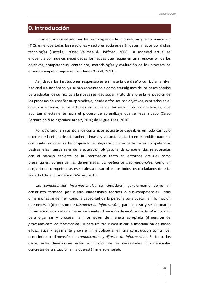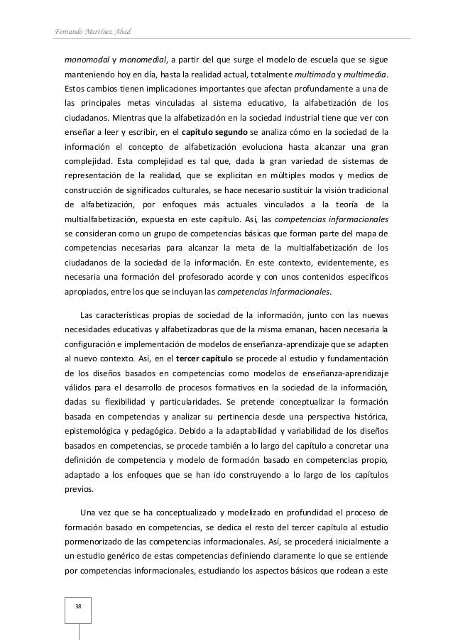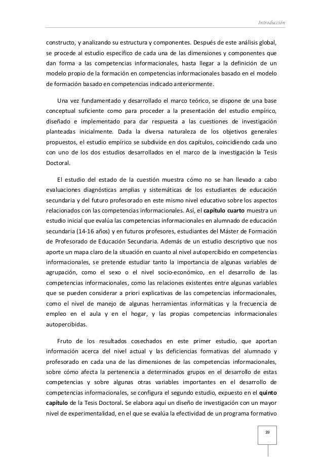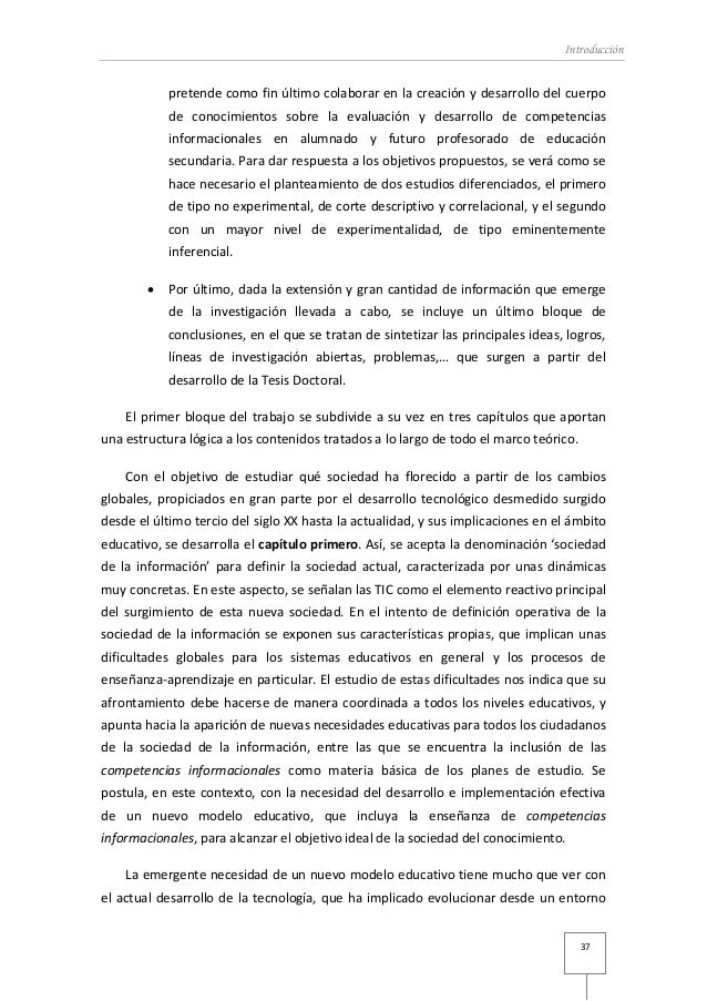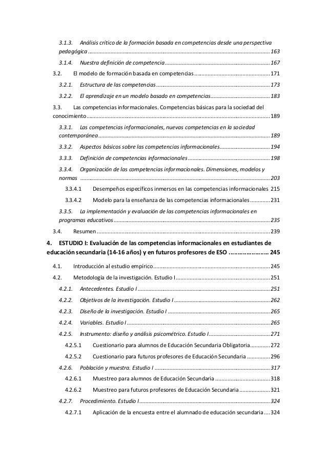 8. 8. 3.1.3. Análisis crítico de la formación basada en competencias desde una perspectivapedagógica........................................................................................................................ 1633.1.4. Nuestra definición de competencia..................................................................... 1673.2. El modelo de formación basada en competencias.................................................. 1713.2.1. Estructura de las competencias........................................................................... 1733.2.2. El aprendizaje en un modelo basado en competencias....................................... 1833.3. Las competencias informacionales. Competencias básicas para la sociedad delconocimiento......................................................................................................................... 1893.3.1. Las competencias informacionales, nuevas competencias en la sociedadcontemporánea................................................................................................................. 1893.3.2. Aspectos básicos sobre las competencias informacionales................................. 1943.3.3. Definición de competencias informacionales...................................................... 1983.3.4. Organización de las competencias informacionales. Dimensiones, modelos ynormas ............................................................................................................................. 2033.3.4.1 Desempeños específicos inmersos en las competencias informacionales 2153.3.4.2 Modelo para la enseñanza de las competencias informacionales ............. 2313.3.5. La implementación y evaluación de las competencias informacionales enprogramas educativos....................................................................................................... 2353.4. Resumen .................................................................................................................. 2394. ESTUDIO I: Evaluación de las competencias informacionales en estudiantes deeducación secundaria (14-16 años) y en futuros profesores de ESO .......................2454.1. Introducción al estudio empírico............................................................................. 2454.2. Metodología de la investigación. Estudio I.............................................................. 2514.2.1. Antecedentes. Estudio I ....................................................................................... 2514.2.2. Objetivos de la investigación. Estudio I ............................................................... 2624.2.3. Diseño de la investigación. Estudio I ................................................................... 2654.2.4. Variables. Estudio I .............................................................................................. 2654.2.5. Instrumento: diseño y análisis psicométrico. Estudio I........................................ 2714.2.5.1 Cuestionario para alumnos de Educación Secundaria Obligatoria............. 2724.2.5.2 Cuestionario para futuros profesores de Educación Secundaria ............... 2964.2.6. Población y muestra. Estudio I ............................................................................ 3174.2.6.1 Muestreo para alumnos de Educación Secundaria .................................... 3184.2.6.2 Muestreo para futuros profesores de Educación Secundaria.................... 3214.2.7. Procedimiento. Estudio I...................................................................................... 3244.2.7.1 Aplicación de la encuesta entre el alumnado de educación secundaria.... 324
