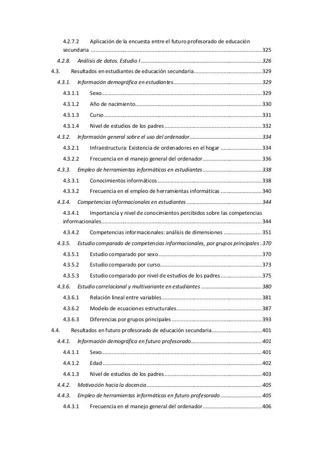 9. 9. 4.2.7.2 Aplicación de la encuesta entre el futuro profesorado de educaciónsecundaria .................................................................................................................... 3254.2.8. Análisis de datos. Estudio I .................................................................................. 3264.3. Resultados en estudiantes de educación secundaria.............................................. 3294.3.1. Información demográfica en estudiantes............................................................ 3294.3.1.1 Sexo............................................................................................................. 3294.3.1.2 Año de nacimiento...................................................................................... 3304.3.1.3 Curso........................................................................................................... 3314.3.1.4 Nivel de estudios de los padres .................................................................. 3324.3.2. Información general sobre el uso del ordenador................................................. 3344.3.2.1 Infraestructura: Existencia de ordenadores en el hogar ............................ 3344.3.2.2 Frecuencia en el manejo general del ordenador........................................ 3364.3.3. Empleo de herramientas informáticas en estudiantes........................................ 3384.3.3.1 Conocimientos informáticos....................................................................... 3384.3.3.2 Frecuencia en el empleo de herramientas informáticas............................ 3404.3.4. Competencias informacionales en estudiantes................................................... 3444.3.4.1 Importancia y nivel de conocimientos percibidos sobre las competenciasinformacionales............................................................................................................. 3444.3.4.2 Competencias informacionales: análisis de dimensiones .......................... 3514.3.5. Estudio comparado de competencias informacionales, por grupos principales . 3704.3.5.1 Estudio comparado por sexo...................................................................... 3704.3.5.2 Estudio comparado por curso..................................................................... 3734.3.5.3 Estudio comparado por nivel de estudios de los padres............................ 3754.3.6. Estudio correlacional y multivariante en estudiantes ......................................... 3804.3.6.1 Relación lineal entre variables.................................................................... 3814.3.6.2 Modelo de ecuaciones estructurales.......................................................... 3874.3.6.3 Diferencias por grupos principales ............................................................. 3934.4. Resultados en futuro profesorado de educación secundaria.................................. 4014.4.1. Información demográfica en futuro profesorado................................................ 4014.4.1.1 Sexo............................................................................................................. 4014.4.1.2 Edad ............................................................................................................ 4024.4.1.3 Nivel de estudios de los padres .................................................................. 4034.4.2. Motivación hacia la docencia.............................................................................. 4054.4.3. Empleo de herramientas informáticas en futuro profesorado............................ 4054.4.3.1 Frecuencia en el manejo general del ordenador........................................ 406