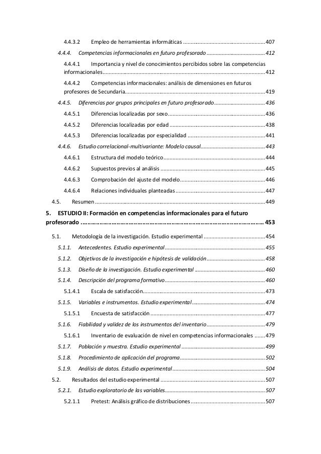 10. 10. 4.4.3.2 Empleo de herramientas informáticas ....................................................... 4074.4.4. Competencias informacionales en futuro profesorado ....................................... 4124.4.4.1 Importancia y nivel de conocimientos percibidos sobre las competenciasinformacionales............................................................................................................. 4124.4.4.2 Competencias informacionales: análisis de dimensiones en futurosprofesores de Secundaria.............................................................................................. 4194.4.5. Diferencias por grupos principales en futuro profesorado.................................. 4364.4.5.1 Diferencias localizadas por sexo................................................................. 4364.4.5.2 Diferencias localizadas por edad ................................................................ 4384.4.5.3 Diferencias localizadas por especialidad .................................................... 4414.4.6. Estudio correlacional-multivariante: Modelo causal........................................... 4434.4.6.1 Estructura del modelo teórico.................................................................... 4444.4.6.2 Supuestos previos al análisis ...................................................................... 4454.4.6.3 Comprobación del ajuste del modelo......................................................... 4464.4.6.4 Relaciones individuales planteadas............................................................ 4474.5. Resumen .................................................................................................................. 4495. ESTUDIO II: Formación en competencias informacionales para el futuroprofesorado ...........................................................................................................4535.1. Metodología de la investigación. Estudio experimental ......................................... 4545.1.1. Antecedentes. Estudio experimental................................................................... 4555.1.2. Objetivos de la investigación e hipótesis de validación....................................... 4585.1.3. Diseño de la investigación. Estudio experimental ............................................... 4605.1.4. Descripción del programa formativo................................................................... 4605.1.4.1 Escala de satisfacción.................................................................................. 4735.1.5. Variables e instrumentos. Estudio experimental................................................. 4745.1.5.1 Encuesta de satisfacción............................................................................. 4775.1.6. Fiabilidad y validez de los instrumentos del inventario....................................... 4795.1.6.1 Inventario de evaluación de nivel en competencias informacionales ....... 4795.1.7. Población y muestra. Estudio experimental ........................................................ 4995.1.8. Procedimiento de aplicación del programa......................................................... 5025.1.9. Análisis de datos. Estudio experimental.............................................................. 5045.2. Resultados del estudio experimental ...................................................................... 5075.2.1. Estudio exploratorio de las variables................................................................... 5075.2.1.1 Pretest: Análisis gráfico de distribuciones.................................................. 507