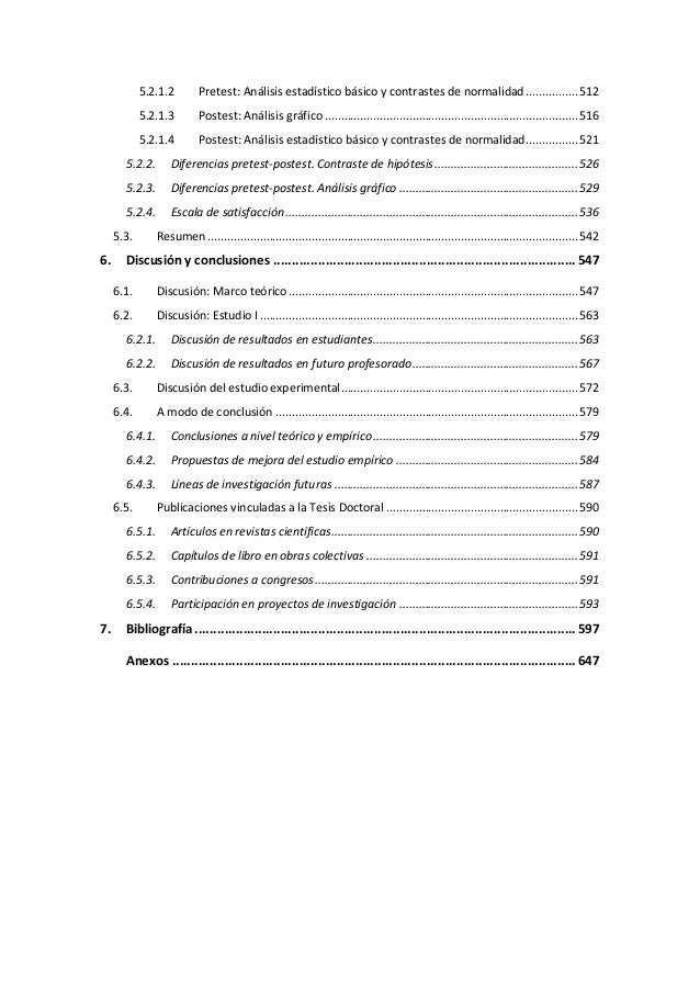 11. 11. 5.2.1.2 Pretest: Análisis estadístico básico y contrastes de normalidad................ 5125.2.1.3 Postest: Análisis gráfico .............................................................................. 5165.2.1.4 Postest: Análisis estadístico básico y contrastes de normalidad................ 5215.2.2. Diferencias pretest-postest. Contraste de hipótesis............................................ 5265.2.3. Diferencias pretest-postest. Análisis gráfico ....................................................... 5295.2.4. Escala de satisfacción.......................................................................................... 5365.3. Resumen .................................................................................................................. 5426. Discusión y conclusiones .................................................................................5476.1. Discusión: Marco teórico......................................................................................... 5476.2. Discusión: Estudio I.................................................................................................. 5636.2.1. Discusión de resultados en estudiantes............................................................... 5636.2.2. Discusión de resultados en futuro profesorado................................................... 5676.3. Discusión del estudio experimental......................................................................... 5726.4. A modo de conclusión ............................................................................................. 5796.4.1. Conclusiones a nivel teórico y empírico............................................................... 5796.4.2. Propuestas de mejora del estudio empírico ........................................................ 5846.4.3. Líneas de investigación futuras ........................................................................... 5876.5. Publicaciones vinculadas a la Tesis Doctoral ........................................................... 5906.5.1. Artículos en revistas científicas............................................................................ 5906.5.2. Capítulos de libro en obras colectivas ................................................................. 5916.5.3. Contribuciones a congresos................................................................................. 5916.5.4. Participación en proyectos de investigación ....................................................... 5937. Bibliografía......................................................................................................597Anexos ............................................................................................................647