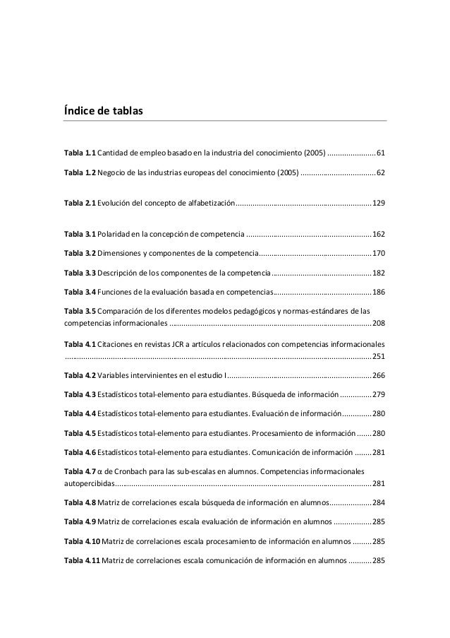 12. 12. Índice de tablasTabla 1.1 Cantidad de empleo basado en la industria del conocimiento (2005) ....................... 61Tabla 1.2 Negocio de las industrias europeas del conocimiento (2005) .................................... 62Tabla 2.1 Evolución del concepto de alfabetización................................................................. 129Tabla 3.1 Polaridad en la concepción de competencia ............................................................ 162Tabla 3.2 Dimensiones y componentes de la competencia...................................................... 170Tabla 3.3 Descripción de los componentes de la competencia................................................ 182Tabla 3.4 Funciones de la evaluación basada en competencias............................................... 186Tabla 3.5 Comparación de los diferentes modelos pedagógicos y normas-estándares de lascompetencias informacionales ................................................................................................. 208Tabla 4.1 Citaciones en revistas JCR a artículos relacionados con competencias informacionales................................................................................................................................................... 251Tabla 4.2 Variables intervinientes en el estudio I..................................................................... 266Tabla 4.3 Estadísticos total-elemento para estudiantes. Búsqueda de información ............... 279Tabla 4.4 Estadísticos total-elemento para estudiantes. Evaluación de información.............. 280Tabla 4.5 Estadísticos total-elemento para estudiantes. Procesamiento de información....... 280Tabla 4.6 Estadísticos total-elemento para estudiantes. Comunicación de información ........ 281Tabla 4.7 α de Cronbach para las sub-escalas en alumnos. Competencias informacionalesautopercibidas........................................................................................................................... 281Tabla 4.8 Matriz de correlaciones escala búsqueda de información en alumnos.................... 284Tabla 4.9 Matriz de correlaciones escala evaluación de información en alumnos .................. 285Tabla 4.10 Matriz de correlaciones escala procesamiento de información en alumnos ......... 285Tabla 4.11 Matriz de correlaciones escala comunicación de información en alumnos ........... 285
