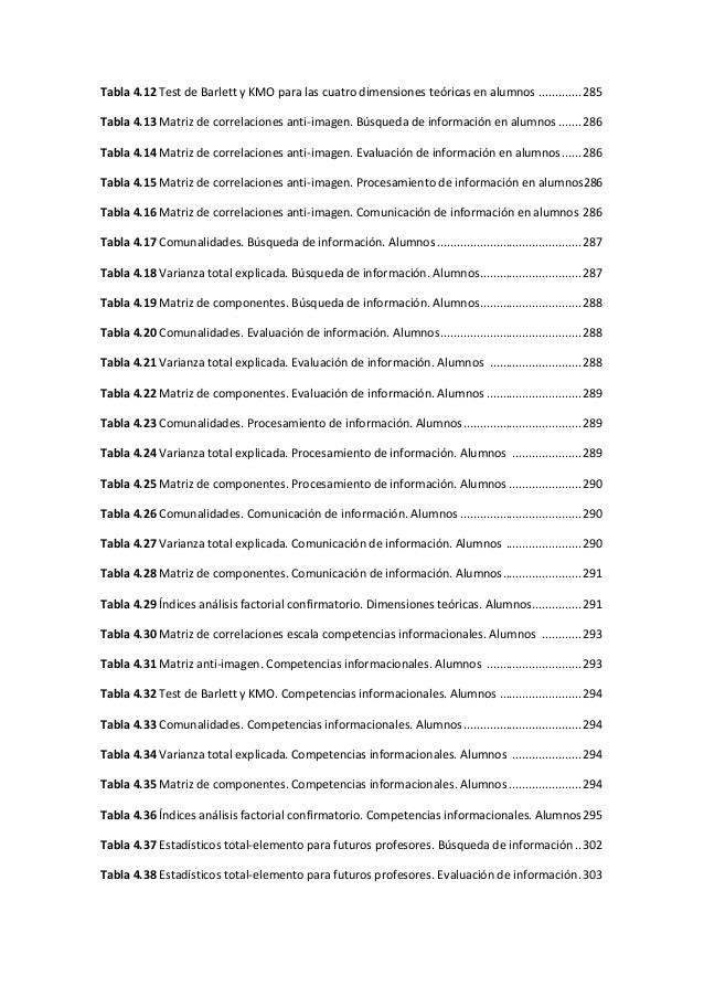 13. 13. Tabla 4.12 Test de Barlett y KMO para las cuatro dimensiones teóricas en alumnos ............. 285Tabla 4.13 Matriz de correlaciones anti-imagen. Búsqueda de información en alumnos ....... 286Tabla 4.14 Matriz de correlaciones anti-imagen. Evaluación de información en alumnos...... 286Tabla 4.15 Matriz de correlaciones anti-imagen. Procesamiento de información en alumnos286Tabla 4.16 Matriz de correlaciones anti-imagen. Comunicación de información en alumnos 286Tabla 4.17 Comunalidades. Búsqueda de información. Alumnos ............................................ 287Tabla 4.18 Varianza total explicada. Búsqueda de información. Alumnos............................... 287Tabla 4.19 Matriz de componentes. Búsqueda de información. Alumnos............................... 288Tabla 4.20 Comunalidades. Evaluación de información. Alumnos........................................... 288Tabla 4.21 Varianza total explicada. Evaluación de información. Alumnos ............................ 288Tabla 4.22 Matriz de componentes. Evaluación de información. Alumnos ............................. 289Tabla 4.23 Comunalidades. Procesamiento de información. Alumnos.................................... 289Tabla 4.24 Varianza total explicada. Procesamiento de información. Alumnos ..................... 289Tabla 4.25 Matriz de componentes. Procesamiento de información. Alumnos ...................... 290Tabla 4.26 Comunalidades. Comunicación de información. Alumnos ..................................... 290Tabla 4.27 Varianza total explicada. Comunicación de información. Alumnos ....................... 290Tabla 4.28 Matriz de componentes. Comunicación de información. Alumnos........................ 291Tabla 4.29 Índices análisis factorial confirmatorio. Dimensiones teóricas. Alumnos............... 291Tabla 4.30 Matriz de correlaciones escala competencias informacionales. Alumnos ............ 293Tabla 4.31 Matriz anti-imagen. Competencias informacionales. Alumnos ............................. 293Tabla 4.32 Test de Barlett y KMO. Competencias informacionales. Alumnos ......................... 294Tabla 4.33 Comunalidades. Competencias informacionales. Alumnos.................................... 294Tabla 4.34 Varianza total explicada. Competencias informacionales. Alumnos ..................... 294Tabla 4.35 Matriz de componentes. Competencias informacionales. Alumnos ...................... 294Tabla 4.36 Índices análisis factorial confirmatorio. Competencias informacionales. Alumnos295Tabla 4.37 Estadísticos total-elemento para futuros profesores. Búsqueda de información.. 302Tabla 4.38 Estadísticos total-elemento para futuros profesores. Evaluación de información. 303