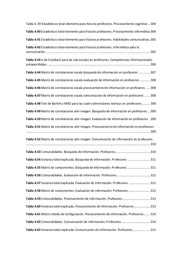 14. 14. Tabla 4. 39 Estadísticos total-elemento para futuros profesores. Procesamiento cognitivo... 304Tabla 4.40 Estadísticos total-elemento para futuros profesores. Procesamiento informático304Tabla 4.41 Estadísticos total-elemento para futuros profesores. Habilidades comunicativas. 305Tabla 4.42 Estadísticos total-elemento para futuros profesores. Informática para lacomunicación. ........................................................................................................................... 305Tabla 4.43 α de Cronbach para las sub-escalas en profesores. Competencias informacionalesautopercibidas........................................................................................................................... 306Tabla 4.44 Matriz de correlaciones escala búsqueda de información en profesores ............. 307Tabla 4.45 Matriz de correlaciones escala evaluación de información en profesores ............ 308Tabla 4.46 Matriz de correlaciones escala procesamiento de información en profesores ..... 308Tabla 4.47 Matriz de correlaciones escala comunicación de información en profesores ....... 308Tabla 4.48 Test de Barlett y KMO para las cuatro dimensiones teóricas en profesores.......... 309Tabla 4.49 Matriz de correlaciones anti-imagen. Búsqueda de información en profesores ... 309Tabla 4.50 Matriz de correlaciones anti-imagen. Evaluación de información en profesores . 309Tabla 4.51 Matriz de correlaciones anti-imagen. Procesamiento de información en profesores................................................................................................................................................... 309Tabla 4.52 Matriz de correlaciones anti-imagen. Comunicación de información en profesores................................................................................................................................................... 310Tabla 4.53 Comunalidades. Búsqueda de información. Profesores ......................................... 310Tabla 4.54 Varianza total explicada. Búsqueda de información. Profesores ........................... 311Tabla 4.55 Matriz de componentes. Búsqueda de información. Profesores ........................... 311Tabla 4.56 Comunalidades. Evaluación de información. Profesores........................................ 312Tabla 4.57 Varianza total explicada. Evaluación de información. Profesores ......................... 312Tabla 4.58 Matriz de componentes. Evaluación de información. Profesores.......................... 312Tabla 4.59 Comunalidades. Procesamiento de información. Profesores................................. 313Tabla 4.60 Varianza total explicada. Procesamiento de información. Profesores ................... 313Tabla 4.61 Matriz rotada de configuración. Procesamiento de información. Profesores........ 314Tabla 4.62 Comunalidades. Comunicación de información. Profesores .................................. 314Tabla 4.63 Varianza total explicada. Comunicación de información. Profesores..................... 315