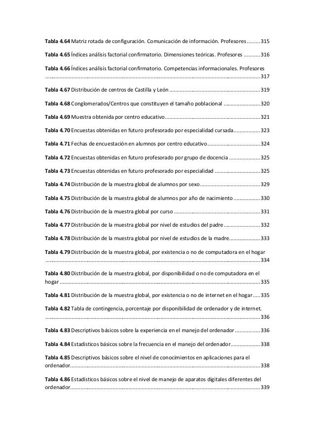 15. 15. Tabla 4.64 Matriz rotada de configuración. Comunicación de información. Profesores ......... 315Tabla 4.65 Índices análisis factorial confirmatorio. Dimensiones teóricas. Profesores ........... 316Tabla 4.66 Índices análisis factorial confirmatorio. Competencias informacionales. Profesores................................................................................................................................................... 317Tabla 4.67 Distribución de centros de Castilla y León .............................................................. 319Tabla 4.68 Conglomerados/Centros que constituyen el tamaño poblacional ......................... 320Tabla 4.69 Muestra obtenida por centro educativo................................................................. 321Tabla 4.70 Encuestas obtenidas en futuro profesorado por especialidad cursada.................. 323Tabla 4.71 Fechas de encuestación en alumnos por centro educativo.................................... 324Tabla 4.72 Encuestas obtenidas en futuro profesorado por grupo de docencia ..................... 325Tabla 4.73 Encuestas obtenidas en futuro profesorado por especialidad ............................... 325Tabla 4.74 Distribución de la muestra global de alumnos por sexo......................................... 329Tabla 4.75 Distribución de la muestra global de alumnos por año de nacimiento .................. 330Tabla 4.76 Distribución de la muestra global por curso ........................................................... 331Tabla 4.77 Distribución de la muestra global por nivel de estudios del padre......................... 332Tabla 4.78 Distribución de la muestra global por nivel de estudios de la madre..................... 333Tabla 4.79 Distribución de la muestra global, por existencia o no de computadora en el hogar................................................................................................................................................... 334Tabla 4.80 Distribución de la muestra global, por disponibilidad o no de computadora en elhogar ......................................................................................................................................... 335Tabla 4.81 Distribución de la muestra global, por existencia o no de internet en el hogar..... 335Tabla 4.82 Tabla de contingencia, porcentaje por disponibilidad de ordenador y de internet.................................................................................................................................................... 336Tabla 4.83 Descriptivos básicos sobre la experiencia en el manejo del ordenador................. 336Tabla 4.84 Estadísticos básicos sobre la frecuencia en el manejo del ordenador.................... 338Tabla 4.85 Descriptivos básicos sobre el nivel de conocimientos en aplicaciones para elordenador.................................................................................................................................. 338Tabla 4.86 Estadísticos básicos sobre el nivel de manejo de aparatos digitales diferentes delordenador.................................................................................................................................. 339