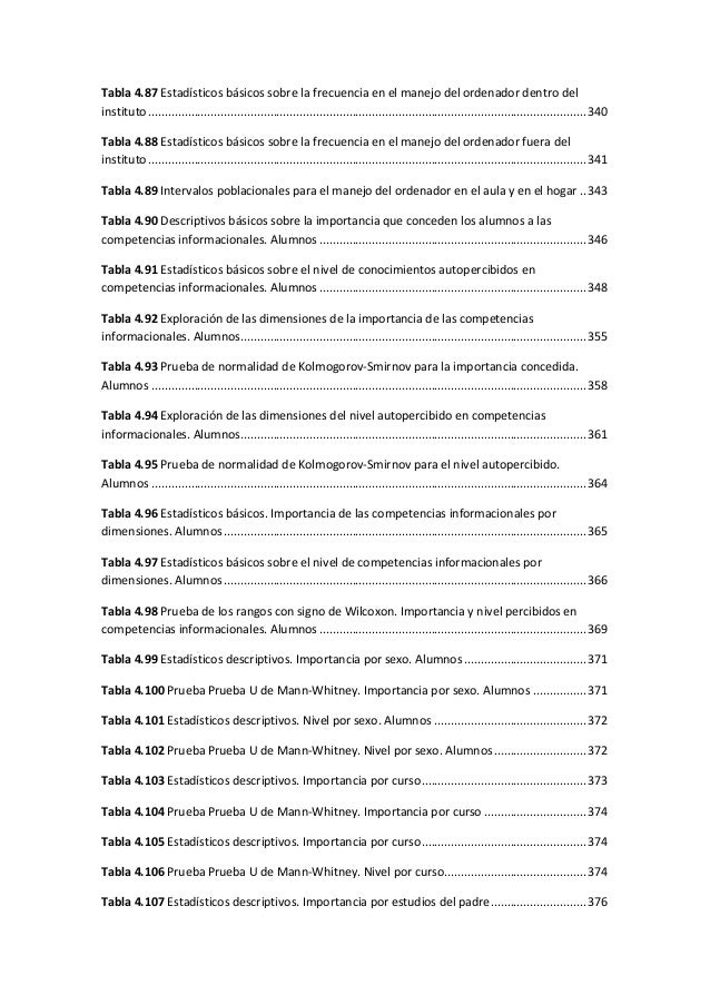 16. 16. Tabla 4.87 Estadísticos básicos sobre la frecuencia en el manejo del ordenador dentro delinstituto..................................................................................................................................... 340Tabla 4.88 Estadísticos básicos sobre la frecuencia en el manejo del ordenador fuera delinstituto..................................................................................................................................... 341Tabla 4.89 Intervalos poblacionales para el manejo del ordenador en el aula y en el hogar .. 343Tabla 4.90 Descriptivos básicos sobre la importancia que conceden los alumnos a lascompetencias informacionales. Alumnos ................................................................................. 346Tabla 4.91 Estadísticos básicos sobre el nivel de conocimientos autopercibidos encompetencias informacionales. Alumnos ................................................................................. 348Tabla 4.92 Exploración de las dimensiones de la importancia de las competenciasinformacionales. Alumnos......................................................................................................... 355Tabla 4.93 Prueba de normalidad de Kolmogorov-Smirnov para la importancia concedida.Alumnos .................................................................................................................................... 358Tabla 4.94 Exploración de las dimensiones del nivel autopercibido en competenciasinformacionales. Alumnos......................................................................................................... 361Tabla 4.95 Prueba de normalidad de Kolmogorov-Smirnov para el nivel autopercibido.Alumnos .................................................................................................................................... 364Tabla 4.96 Estadísticos básicos. Importancia de las competencias informacionales pordimensiones. Alumnos.............................................................................................................. 365Tabla 4.97 Estadísticos básicos sobre el nivel de competencias informacionales pordimensiones. Alumnos.............................................................................................................. 366Tabla 4.98 Prueba de los rangos con signo de Wilcoxon. Importancia y nivel percibidos encompetencias informacionales. Alumnos ................................................................................. 369Tabla 4.99 Estadísticos descriptivos. Importancia por sexo. Alumnos ..................................... 371Tabla 4.100 Prueba Prueba U de Mann-Whitney. Importancia por sexo. Alumnos ................ 371Tabla 4.101 Estadísticos descriptivos. Nivel por sexo. Alumnos .............................................. 372Tabla 4.102 Prueba Prueba U de Mann-Whitney. Nivel por sexo. Alumnos............................ 372Tabla 4.103 Estadísticos descriptivos. Importancia por curso.................................................. 373Tabla 4.104 Prueba Prueba U de Mann-Whitney. Importancia por curso ............................... 374Tabla 4.105 Estadísticos descriptivos. Importancia por curso.................................................. 374Tabla 4.106 Prueba Prueba U de Mann-Whitney. Nivel por curso........................................... 374Tabla 4.107 Estadísticos descriptivos. Importancia por estudios del padre............................. 376