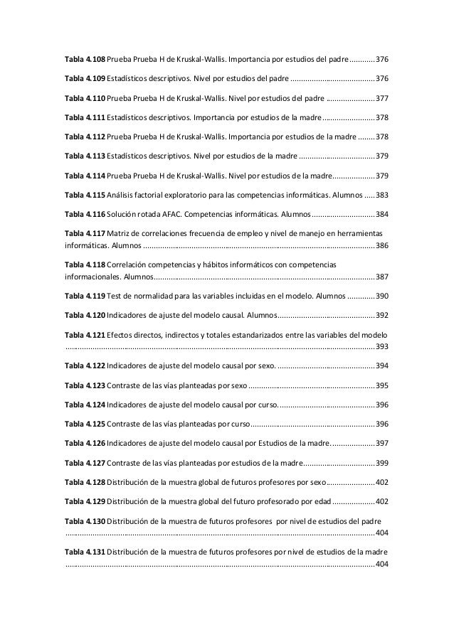 17. 17. Tabla 4.108 Prueba Prueba H de Kruskal-Wallis. Importancia por estudios del padre............ 376Tabla 4.109 Estadísticos descriptivos. Nivel por estudios del padre ........................................ 376Tabla 4.110 Prueba Prueba H de Kruskal-Wallis. Nivel por estudios del padre ....................... 377Tabla 4.111 Estadísticos descriptivos. Importancia por estudios de la madre......................... 378Tabla 4.112 Prueba Prueba H de Kruskal-Wallis. Importancia por estudios de la madre ........ 378Tabla 4.113 Estadísticos descriptivos. Nivel por estudios de la madre .................................... 379Tabla 4.114 Prueba Prueba H de Kruskal-Wallis. Nivel por estudios de la madre.................... 379Tabla 4.115 Análisis factorial exploratorio para las competencias informáticas. Alumnos ..... 383Tabla 4.116 Solución rotada AFAC. Competencias informáticas. Alumnos.............................. 384Tabla 4.117 Matriz de correlaciones frecuencia de empleo y nivel de manejo en herramientasinformáticas. Alumnos .............................................................................................................. 386Tabla 4.118 Correlación competencias y hábitos informáticos con competenciasinformacionales. Alumnos......................................................................................................... 387Tabla 4.119 Test de normalidad para las variables incluidas en el modelo. Alumnos ............. 390Tabla 4.120 Indicadores de ajuste del modelo causal. Alumnos.............................................. 392Tabla 4.121 Efectos directos, indirectos y totales estandarizados entre las variables del modelo................................................................................................................................................... 393Tabla 4.122 Indicadores de ajuste del modelo causal por sexo. .............................................. 394Tabla 4.123 Contraste de las vías planteadas por sexo ............................................................ 395Tabla 4.124 Indicadores de ajuste del modelo causal por curso.............................................. 396Tabla 4.125 Contraste de las vías planteadas por curso........................................................... 396Tabla 4.126 Indicadores de ajuste del modelo causal por Estudios de la madre..................... 397Tabla 4.127 Contraste de las vías planteadas por estudios de la madre.................................. 399Tabla 4.128 Distribución de la muestra global de futuros profesores por sexo....................... 402Tabla 4.129 Distribución de la muestra global del futuro profesorado por edad .................... 402Tabla 4.130 Distribución de la muestra de futuros profesores por nivel de estudios del padre................................................................................................................................................... 404Tabla 4.131 Distribución de la muestra de futuros profesores por nivel de estudios de la madre................................................................................................................................................... 404