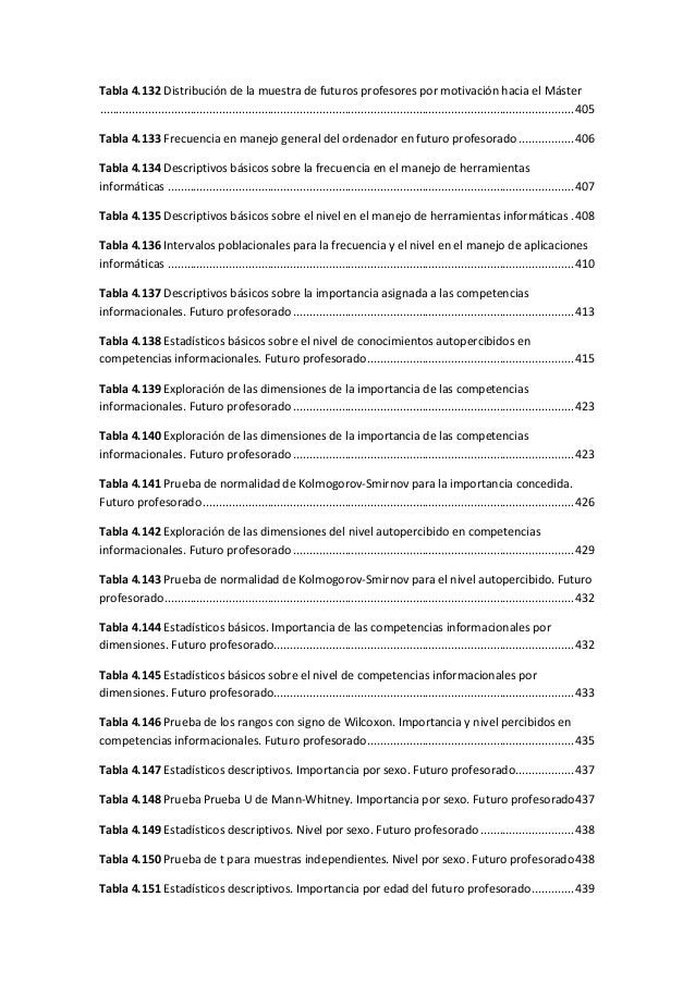 18. 18. Tabla 4.132 Distribución de la muestra de futuros profesores por motivación hacia el Máster................................................................................................................................................... 405Tabla 4.133 Frecuencia en manejo general del ordenador en futuro profesorado ................. 406Tabla 4.134 Descriptivos básicos sobre la frecuencia en el manejo de herramientasinformáticas .............................................................................................................................. 407Tabla 4.135 Descriptivos básicos sobre el nivel en el manejo de herramientas informáticas . 408Tabla 4.136 Intervalos poblacionales para la frecuencia y el nivel en el manejo de aplicacionesinformáticas .............................................................................................................................. 410Tabla 4.137 Descriptivos básicos sobre la importancia asignada a las competenciasinformacionales. Futuro profesorado ....................................................................................... 413Tabla 4.138 Estadísticos básicos sobre el nivel de conocimientos autopercibidos encompetencias informacionales. Futuro profesorado................................................................ 415Tabla 4.139 Exploración de las dimensiones de la importancia de las competenciasinformacionales. Futuro profesorado ....................................................................................... 423Tabla 4.140 Exploración de las dimensiones de la importancia de las competenciasinformacionales. Futuro profesorado ....................................................................................... 423Tabla 4.141 Prueba de normalidad de Kolmogorov-Smirnov para la importancia concedida.Futuro profesorado................................................................................................................... 426Tabla 4.142 Exploración de las dimensiones del nivel autopercibido en competenciasinformacionales. Futuro profesorado ....................................................................................... 429Tabla 4.143 Prueba de normalidad de Kolmogorov-Smirnov para el nivel autopercibido. Futuroprofesorado............................................................................................................................... 432Tabla 4.144 Estadísticos básicos. Importancia de las competencias informacionales pordimensiones. Futuro profesorado............................................................................................. 432Tabla 4.145 Estadísticos básicos sobre el nivel de competencias informacionales pordimensiones. Futuro profesorado............................................................................................. 433Tabla 4.146 Prueba de los rangos con signo de Wilcoxon. Importancia y nivel percibidos encompetencias informacionales. Futuro profesorado................................................................ 435Tabla 4.147 Estadísticos descriptivos. Importancia por sexo. Futuro profesorado.................. 437Tabla 4.148 Prueba Prueba U de Mann-Whitney. Importancia por sexo. Futuro profesorado437Tabla 4.149 Estadísticos descriptivos. Nivel por sexo. Futuro profesorado ............................. 438Tabla 4.150 Prueba de t para muestras independientes. Nivel por sexo. Futuro profesorado438Tabla 4.151 Estadísticos descriptivos. Importancia por edad del futuro profesorado............. 439