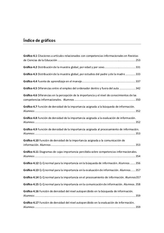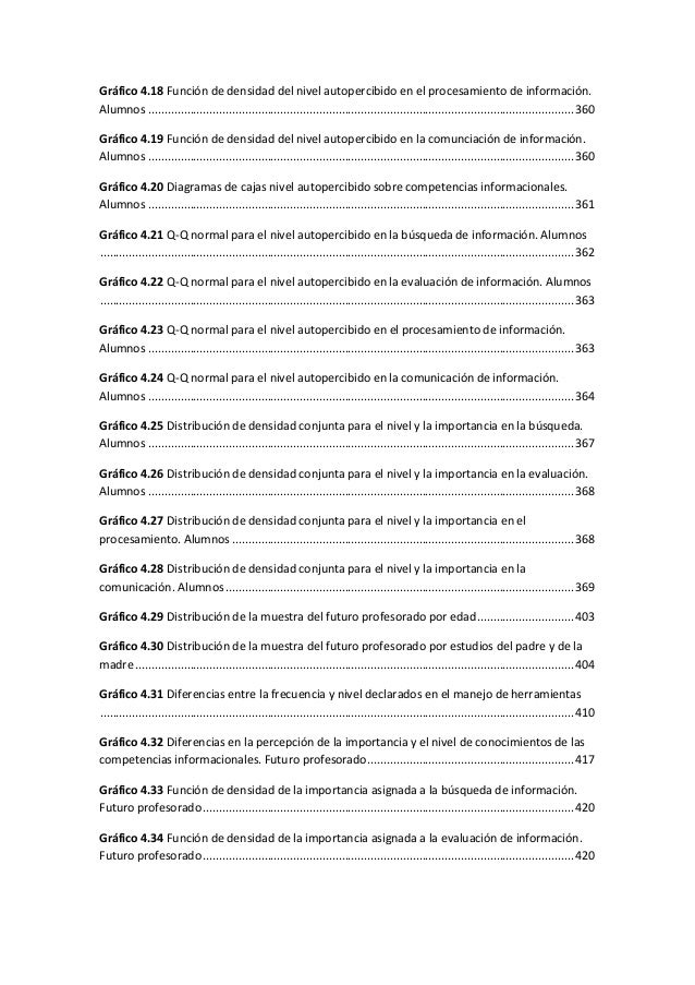21. 21. Índice de gráficosGráfico 4.1 Citaciones a artículos relacionados con competencias informacionales en Revistasde Ciencias de la Educación ...................................................................................................... 253Gráfico 4.2 Distribución de la muestra global, por edad y por sexo......................................... 331Gráfico 4.3 Distribución de la muestra global, por estudios del padre y de la madre ............. 333Gráfico 4.4 Fuente de aprendizaje en el manejo...................................................................... 337Gráfico 4.5 Diferencias entre el empleo del ordenador dentro y fuera del aula ..................... 342Gráfico 4.6 Diferencias en la percepción de la importancia y el nivel de conocimientos de lascompetencias informacionales. Alumnos ................................................................................ 350Gráfico 4.7 Función de densidad de la importancia asignada a la búsqueda de información.Alumnos .................................................................................................................................... 352Gráfico 4.8 Función de densidad de la importancia asignada a la evaluación de información.Alumnos .................................................................................................................................... 352Gráfico 4.9 Función de densidad de la importancia asignada al procesamiento de información.Alumnos .................................................................................................................................... 353Gráfico 4.10 Función de densidad de la importancia asignada a la comunicación deinformación. Alumnos............................................................................................................... 353Gráfico 4.11 Diagramas de cajas importancia percibida sobre competencias informacionales.Alumnos .................................................................................................................................... 354Gráfico 4.12 Q-Q normal para la importancia en la búsqueda de información. Alumnos ....... 356Gráfico 4.13 Q-Q normal para la importancia en la evaluación de información. Alumnos...... 357Gráfico 4.14 Q-Q normal para la importancia en el procesamiento de información. Alumnos357Gráfico 4.15 Q-Q normal para la importancia en la comunicación de información. Alumnos. 358Gráfico 4.16 Función de densidad del nivel autopercibido en la búsqueda de información.Alumnos .................................................................................................................................... 359Gráfico 4.17 Función de densidad del nivel autopercibido en la evaluación de información.Alumnos .................................................................................................................................... 359