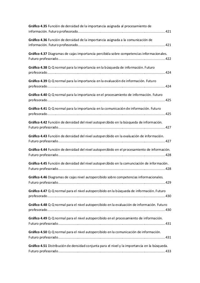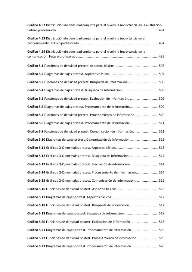 24. 24. Gráfico 4.52 Distribución de densidad conjunta para el nivel y la importancia en la evaluación.Futuro profesorado................................................................................................................... 434Gráfico 4.53 Distribución de densidad conjunta para el nivel y la importancia en elprocesamiento. Futuro profesorado......................................................................................... 434Gráfico 4.54 Distribución de densidad conjunta para el nivel y la importancia en lacomunicación. Futuro profesorado........................................................................................... 435Gráfico 5.1 Funciones de densidad pretest. Aspectos básicos................................................. 507Gráfico 5.2 Diagramas de cajas pretest. Aspectos básicos....................................................... 507Gráfico 5.3 Funciones de densidad pretest. Búsqueda de información................................... 508Gráfico 5.4 Diagramas de cajas pretest. Búsqueda de información......................................... 508Gráfico 5.5 Funciones de densidad pretest. Evaluación de información. ................................ 509Gráfico 5.6 Diagramas de cajas pretest. Procesamiento de información................................. 509Gráfico 5.7 Funciones de densidad pretest. Procesamiento de información........................... 510Gráfico 5.8 Diagramas de cajas pretest. Procesamiento de información................................. 511Gráfico 5.9 Funciones de densidad pretest. Comunicación de información............................ 511Gráfico 5.10 Diagramas de cajas pretest. Comunicación de información................................ 512Gráfico 5.11 Gráficos Q-Q normales pretest. Aspectos básicos. .............................................. 513Gráfico 5.12 Gráficos Q-Q normales pretest. Búsqueda de información................................. 514Gráfico 5.13 Gráficos Q-Q normales pretest. Evaluación de información................................ 514Gráfico 5.14 Gráficos Q-Q normales pretest. Procesamiento de información......................... 514Gráfico 5.15 Gráficos Q-Q normales pretest. Comunicación de información. ......................... 515Gráfico 5.16 Funciones de densidad postest. Aspectos básicos............................................... 516Gráfico 5.17 Diagramas de cajas postest. Aspectos básicos..................................................... 517Gráfico 5.18 Funciones de densidad postest. Búsqueda de información................................. 517Gráfico 5.19 Diagramas de cajas postest. Búsqueda de información....................................... 518Gráfico 5.20 Funciones de densidad postest. Evaluación de información. .............................. 518Gráfico 5.21 Diagramas de cajas postest. Procesamiento de información. ............................. 519Gráfico 5.22 Funciones de densidad postest. Procesamiento de información. ....................... 519Gráfico 5.23 Diagramas de cajas postest. Procesamiento de información. ............................. 520