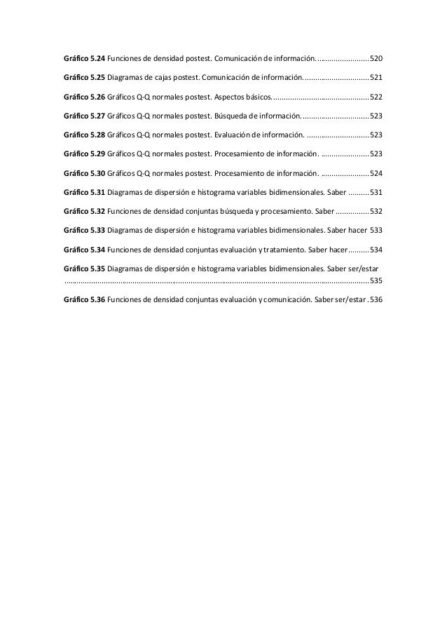 25. 25. Gráfico 5.24 Funciones de densidad postest. Comunicación de información.......................... 520Gráfico 5.25 Diagramas de cajas postest. Comunicación de información................................ 521Gráfico 5.26 Gráficos Q-Q normales postest. Aspectos básicos............................................... 522Gráfico 5.27 Gráficos Q-Q normales postest. Búsqueda de información................................. 523Gráfico 5.28 Gráficos Q-Q normales postest. Evaluación de información. .............................. 523Gráfico 5.29 Gráficos Q-Q normales postest. Procesamiento de información. ....................... 523Gráfico 5.30 Gráficos Q-Q normales postest. Procesamiento de información. ....................... 524Gráfico 5.31 Diagramas de dispersión e histograma variables bidimensionales. Saber .......... 531Gráfico 5.32 Funciones de densidad conjuntas búsqueda y procesamiento. Saber ................ 532Gráfico 5.33 Diagramas de dispersión e histograma variables bidimensionales. Saber hacer 533Gráfico 5.34 Funciones de densidad conjuntas evaluación y tratamiento. Saber hacer.......... 534Gráfico 5.35 Diagramas de dispersión e histograma variables bidimensionales. Saber ser/estar................................................................................................................................................... 535Gráfico 5.36 Funciones de densidad conjuntas evaluación y comunicación. Saber ser/estar. 536