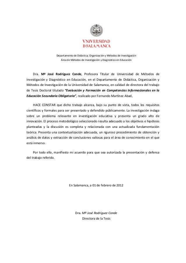 2. 2. Departamento de Didáctica, Organización y Métodos de InvestigaciónÁrea de Métodos de Investigación y Diagnóstico en EducaciónDra. Mª José Rodríguez Conde, Profesora Titular de Universidad de Métodos deInvestigación y Diagnóstico en Educación, en el Departamento de Didáctica, Organización yMétodos de Investigación de la Universidad de Salamanca, en calidad de directora del trabajode Tesis Doctoral titulado “Evaluación y Formación en Competencias Informacionales en laEducación Secundaria Obligatoria”, realizado por Fernando Martínez Abad,HACE CONSTAR que dicho trabajo alcanza, bajo su punto de vista, todos los requisitoscientíficos y formales para ser presentado y defendido públicamente. La investigación indagasobre un problema relevante en investigación educativa y presenta un grado alto deinnovación. El proceso metodológico seleccionado resulta adecuado a los objetivos e hipótesisplanteadas y la discusión es completa y relacionada con una actualizada fundamentaciónteórica. Presenta una contextualización adecuada, un riguroso procedimiento de obtención yanálisis de datos y extracción de conclusiones valiosas para el área de conocimiento en el queestá inmerso.Por todo ello, manifiesto mi acuerdo para que sea autorizada la presentación y defensadel trabajo referido.En Salamanca, a 01 de febrero de 2012Dra. Mª José Rodríguez CondeDirectora de la Tesis