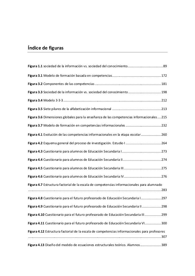 26. 26. Índice de figurasFigura 1.1 sociedad de la información vs. sociedad del conocimiento....................................... 89Figura 3.1 Modelo de formación basada en competencias...................................................... 172Figura 3.2 Componentes de las competencias ......................................................................... 181Figura 3.3 Sociedad de la información vs. sociedad del conocimiento .................................... 198Figura 3.4 Modelo 3·3·3............................................................................................................ 212Figura 3.5 Siete pilares de la alfabetización informacional ...................................................... 213Figura 3.6 Dimensiones globales para la enseñanza de las competencias informacionales.... 215Figura 3.7 Modelo de formación en competencias informacionales ....................................... 232Figura 4.1 Evolución de las competencias informacionales en la etapa escolar ...................... 260Figura 4.2 Esquema general del proceso de investigación. Estudio I ....................................... 264Figura 4.3 Cuestionario para alumnos de Educación Secundaria I........................................... 273Figura 4.4 Cuestionario para alumnos de Educación Secundaria II.......................................... 274Figura 4.5 Cuestionario para alumnos de Educación Secundaria III......................................... 275Figura 4.6 Cuestionario para alumnos de Educación Secundaria IV......................................... 276Figura 4.7 Estructura factorial de la escala de competencias informacionales para alumnado................................................................................................................................................... 283Figura 4.8 Cuestionario para el futuro profesorado de Educación Secundaria I...................... 297Figura 4.9 Cuestionario para el futuro profesorado de Educación Secundaria II..................... 298Figura 4.10 Cuestionario para el futuro profesorado de Educación Secundaria III.................. 299Figura 4.11 Cuestionario para el futuro profesorado de Educación Secundaria VI.................. 300Figura 4.12 Estructura factorial de la escala de competencias informacionales para profesores................................................................................................................................................... 307Figura 4.13 Diseño del modelo de ecuaciones estructurales teórico. Alumnos....................... 389