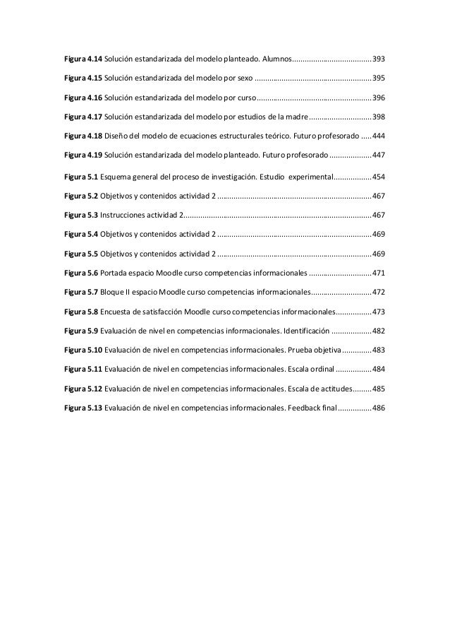27. 27. Figura 4.14 Solución estandarizada del modelo planteado. Alumnos...................................... 393Figura 4.15 Solución estandarizada del modelo por sexo ........................................................ 395Figura 4.16 Solución estandarizada del modelo por curso....................................................... 396Figura 4.17 Solución estandarizada del modelo por estudios de la madre.............................. 398Figura 4.18 Diseño del modelo de ecuaciones estructurales teórico. Futuro profesorado ..... 444Figura 4.19 Solución estandarizada del modelo planteado. Futuro profesorado .................... 447Figura 5.1 Esquema general del proceso de investigación. Estudio experimental.................. 454Figura 5.2 Objetivos y contenidos actividad 2 .......................................................................... 467Figura 5.3 Instrucciones actividad 2.......................................................................................... 467Figura 5.4 Objetivos y contenidos actividad 2 .......................................................................... 469Figura 5.5 Objetivos y contenidos actividad 2 .......................................................................... 469Figura 5.6 Portada espacio Moodle curso competencias informacionales .............................. 471Figura 5.7 Bloque II espacio Moodle curso competencias informacionales............................. 472Figura 5.8 Encuesta de satisfacción Moodle curso competencias informacionales................. 473Figura 5.9 Evaluación de nivel en competencias informacionales. Identificación ................... 482Figura 5.10 Evaluación de nivel en competencias informacionales. Prueba objetiva.............. 483Figura 5.11 Evaluación de nivel en competencias informacionales. Escala ordinal ................. 484Figura 5.12 Evaluación de nivel en competencias informacionales. Escala de actitudes......... 485Figura 5.13 Evaluación de nivel en competencias informacionales. Feedback final ................ 486