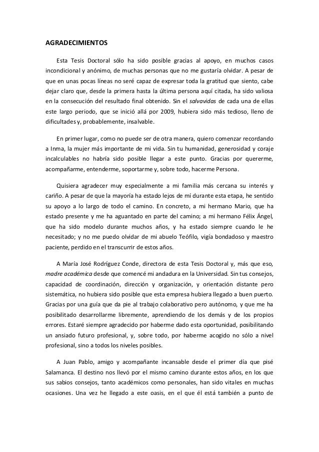 4. 4. AGRADECIMIENTOSEsta Tesis Doctoral sólo ha sido posible gracias al apoyo, en muchos casosincondicional y anónimo, de muchas personas que no me gustaría olvidar. A pesar deque en unas pocas líneas no seré capaz de expresar toda la gratitud que siento, cabedejar claro que, desde la primera hasta la última persona aquí citada, ha sido valiosaen la consecución del resultado final obtenido. Sin el salvavidas de cada una de ellaseste largo periodo, que se inició allá por 2009, hubiera sido más tedioso, lleno dedificultades y, probablemente, insalvable.En primer lugar, como no puede ser de otra manera, quiero comenzar recordandoa Inma, la mujer más importante de mi vida. Sin tu humanidad, generosidad y corajeincalculables no habría sido posible llegar a este punto. Gracias por quererme,acompañarme, entenderme, soportarme y, sobre todo, hacerme Persona.Quisiera agradecer muy especialmente a mi familia más cercana su interés ycariño. A pesar de que la mayoría ha estado lejos de mí durante esta etapa, he sentidosu apoyo a lo largo de todo el camino. En concreto, a mi hermano Mario, que haestado presente y me ha aguantado en parte del camino; a mi hermano Félix Ángel,que ha sido modelo durante muchos años, y ha estado siempre cuando le henecesitado; y no me puedo olvidar de mi abuelo Teófilo, vigía bondadoso y maestropaciente, perdido en el transcurrir de estos años.A María José Rodríguez Conde, directora de esta Tesis Doctoral y, más que eso,madre académica desde que comencé mi andadura en la Universidad. Sin tus consejos,capacidad de coordinación, dirección y organización, y orientación distante perosistemática, no hubiera sido posible que esta empresa hubiera llegado a buen puerto.Gracias por una guía que da pie al trabajo colaborativo pero autónomo, y que me haposibilitado desarrollarme libremente, aprendiendo de los demás y de los propioserrores. Estaré siempre agradecido por haberme dado esta oportunidad, posibilitandoun ansiado futuro profesional, y, sobre todo, por haberme acogido no sólo a nivelprofesional, sino a todos los niveles posibles.A Juan Pablo, amigo y acompañante incansable desde el primer día que piséSalamanca. El destino nos llevó por el mismo camino durante estos años, en los quesus sabios consejos, tanto académicos como personales, han sido vitales en muchasocasiones. Una vez he llegado a este oasis, en el que él está también a punto de