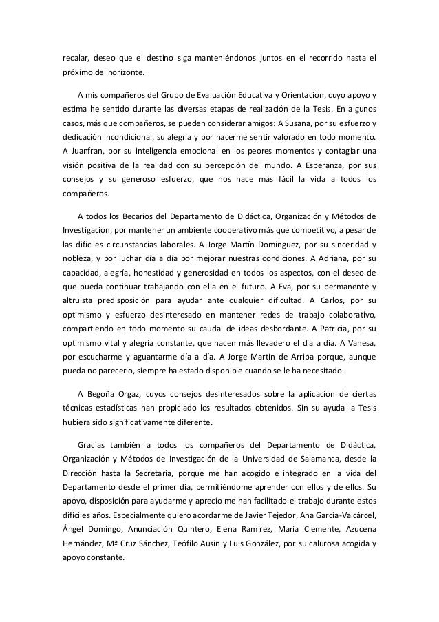5. 5. recalar, deseo que el destino siga manteniéndonos juntos en el recorrido hasta elpróximo del horizonte.A mis compañeros del Grupo de Evaluación Educativa y Orientación, cuyo apoyo yestima he sentido durante las diversas etapas de realización de la Tesis. En algunoscasos, más que compañeros, se pueden considerar amigos: A Susana, por su esfuerzo ydedicación incondicional, su alegría y por hacerme sentir valorado en todo momento.A Juanfran, por su inteligencia emocional en los peores momentos y contagiar unavisión positiva de la realidad con su percepción del mundo. A Esperanza, por susconsejos y su generoso esfuerzo, que nos hace más fácil la vida a todos loscompañeros.A todos los Becarios del Departamento de Didáctica, Organización y Métodos deInvestigación, por mantener un ambiente cooperativo más que competitivo, a pesar delas difíciles circunstancias laborales. A Jorge Martín Domínguez, por su sinceridad ynobleza, y por luchar día a día por mejorar nuestras condiciones. A Adriana, por sucapacidad, alegría, honestidad y generosidad en todos los aspectos, con el deseo deque pueda continuar trabajando con ella en el futuro. A Eva, por su permanente yaltruista predisposición para ayudar ante cualquier dificultad. A Carlos, por suoptimismo y esfuerzo desinteresado en mantener redes de trabajo colaborativo,compartiendo en todo momento su caudal de ideas desbordante. A Patricia, por suoptimismo vital y alegría constante, que hacen más llevadero el día a día. A Vanesa,por escucharme y aguantarme día a día. A Jorge Martín de Arriba porque, aunquepueda no parecerlo, siempre ha estado disponible cuando se le ha necesitado.A Begoña Orgaz, cuyos consejos desinteresados sobre la aplicación de ciertastécnicas estadísticas han propiciado los resultados obtenidos. Sin su ayuda la Tesishubiera sido significativamente diferente.Gracias también a todos los compañeros del Departamento de Didáctica,Organización y Métodos de Investigación de la Universidad de Salamanca, desde laDirección hasta la Secretaría, porque me han acogido e integrado en la vida delDepartamento desde el primer día, permitiéndome aprender con ellos y de ellos. Suapoyo, disposición para ayudarme y aprecio me han facilitado el trabajo durante estosdifíciles años. Especialmente quiero acordarme de Javier Tejedor, Ana García-Valcárcel,Ángel Domingo, Anunciación Quintero, Elena Ramírez, María Clemente, AzucenaHernández, Mª Cruz Sánchez, Teófilo Ausín y Luis González, por su calurosa acogida yapoyo constante.