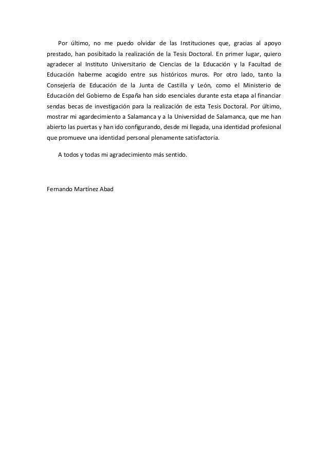 6. 6. Por último, no me puedo olvidar de las Instituciones que, gracias al apoyoprestado, han posibitado la realización de la Tesis Doctoral. En primer lugar, quieroagradecer al Instituto Universitario de Ciencias de la Educación y la Facultad deEducación haberme acogido entre sus históricos muros. Por otro lado, tanto laConsejería de Educación de la Junta de Castilla y León, como el Ministerio deEducación del Gobierno de España han sido esenciales durante esta etapa al financiarsendas becas de investigación para la realización de esta Tesis Doctoral. Por último,mostrar mi agardecimiento a Salamanca y a la Universidad de Salamanca, que me hanabierto las puertas y han ido configurando, desde mi llegada, una identidad profesionalque promueve una identidad personal plenamente satisfactoria.A todos y todas mi agradecimiento más sentido.Fernando Martínez Abad