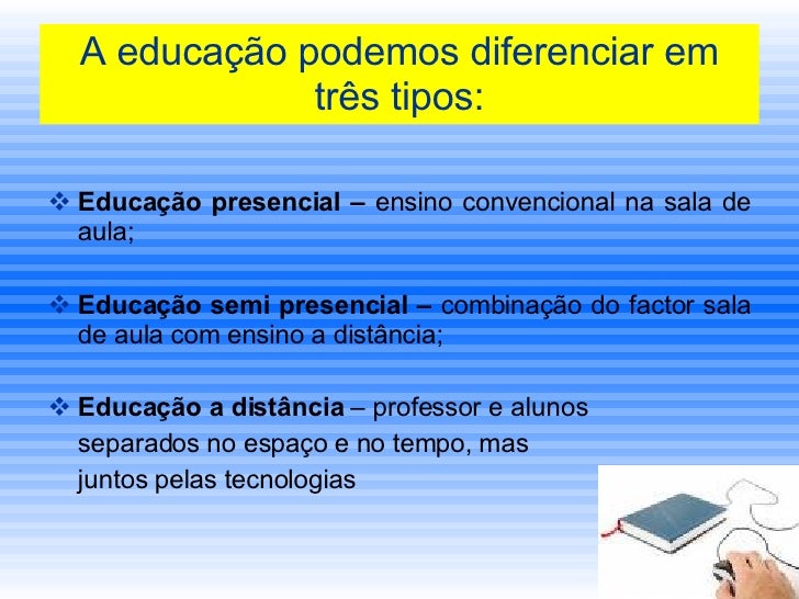 A educação podemos diferenciar em três tipos: <ul><li>Educação presencial –  ensino convencional na sala de aula; </li></u...