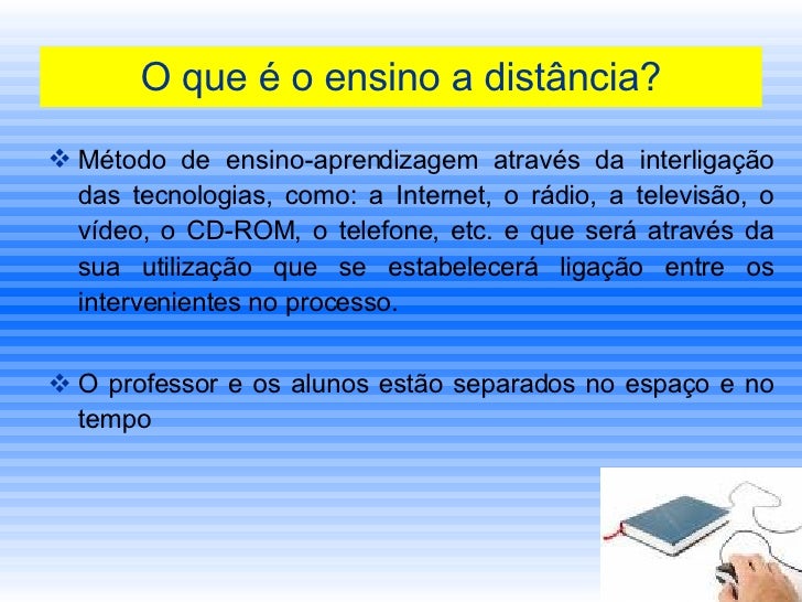 O que é o ensino a distância? <ul><li>Método de ensino-aprendizagem através da interligação das tecnologias, como: a Inter...