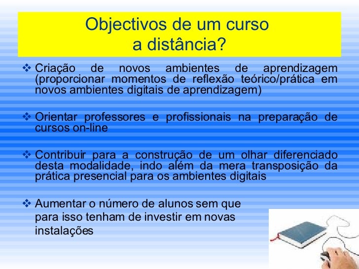 Objectivos de um curso  a distância? <ul><li>Criação de novos ambientes de aprendizagem (proporcionar momentos de reflexão...