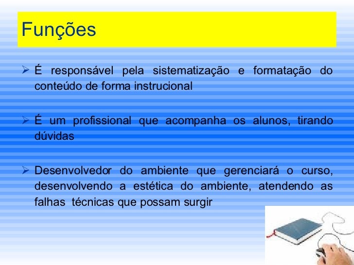 Funções <ul><li>É responsável pela sistematização e formatação do conteúdo de forma instrucional </li></ul><ul><li>É um pr...