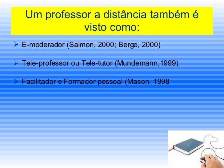 7. 7. Um professor a distância também é visto como: <ul><li>E-moderador (Salmon, 2000; Berge, 2000) </li></ul><ul><li>Tele-professor ou Tele-tutor (Mundemann,1999) </li></ul><ul><li>Facilitador e Formador pessoal (Mason, 1998 </li></ul>
