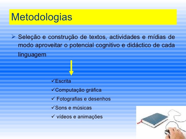 Metodologias  <ul><li>Seleção e construção de textos, actividades e mídias de modo aproveitar o potencial cognitivo e didá...