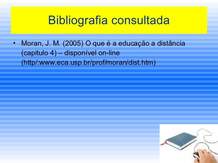 Bibliografia consultada <ul><li>Moran, J. M. (2005) O que é a educação a distância (capitulo 4) – disponível on-line (http...