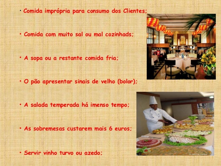 2. 2. <ul><li>Comida imprópria para consumo dos Clientes; </li></ul><ul><li>Comida com muito sal ou mal cozinhads; </li></ul><ul><li>A sopa ou a restante comida fria; </li></ul><ul><li>O pão apresentar sinais de velho (bolor); </li></ul><ul><li>A salada temperada há imenso tempo; </li></ul><ul><li>As sobremesas custarem mais 6 euros; </li></ul><ul><li>Servir vinho turvo ou azedo; </li></ul><ul><li>Comida com moscas ou cabelos; </li></ul>