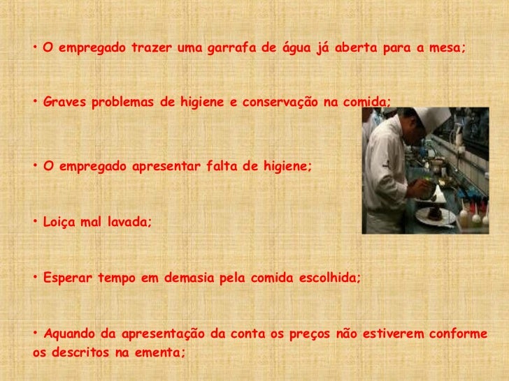 3. 3. <ul><li>O empregado trazer uma garrafa de água já aberta para a mesa; </li></ul><ul><li>Graves problemas de higiene e conservação na comida; </li></ul><ul><li>O empregado apresentar falta de higiene; </li></ul><ul><li>Loiça mal lavada; </li></ul><ul><li>Esperar tempo em demasia pela comida escolhida; </li></ul><ul><li>Aquando da apresentação da conta os preços não estiverem conforme os descritos na ementa; </li></ul><ul><li>Quando nos é imposto o Pagamento de entradas que não pedimos; </li></ul>