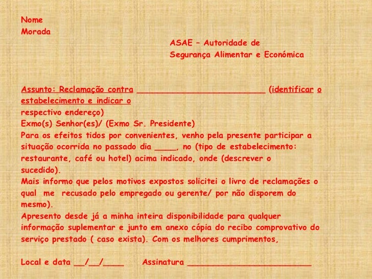 6. 6. Nome Morada ASAE – Autoridade de Segurança Alimentar e Económica Assunto: Reclamação contra _________________________ ( identificar o estabelecimento e indicar o respectivo endereço) Exmo(s) Senhor(es)/ (Exmo Sr. Presidente) Para os efeitos tidos por convenientes, venho pela presente participar a situação ocorrida no passado dia ____, no (tipo de estabelecimento: restaurante, café ou hotel) acima indicado, onde (descrever o sucedido). Mais informo que pelos motivos expostos solicitei o livro de reclamações o qual me recusado pelo empregado ou gerente/ por não disporem do mesmo). Apresento desde já a minha inteira disponibilidade para qualquer informação suplementar e junto em anexo cópia do recibo comprovativo do serviço prestado ( caso exista). Com os melhores cumprimentos, Local e data __/__/____ Assinatura ________________________